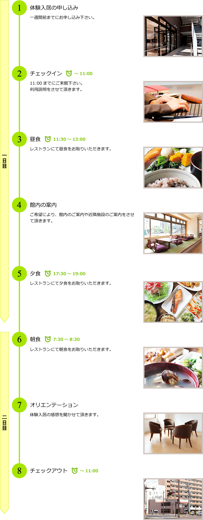 寝起きから食事・設備・周辺への交通利便性など一日を通して生活の流れを体験して頂けます。実体験をすることで、見学だけでは分からない実際の生活や利便性、スタッフの対応力などを知って頂けます。